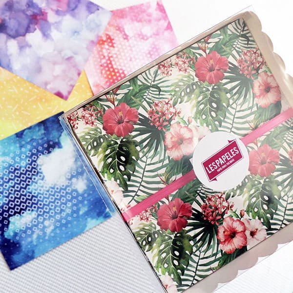 Caja Scrap Mix tropical ademĂ¡s de los mĂºltiples diseños y colores, los papeles estan impresos en papel ilustraciĂ³n brillante de 150 grs.