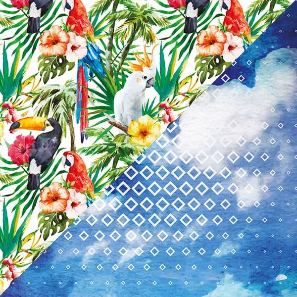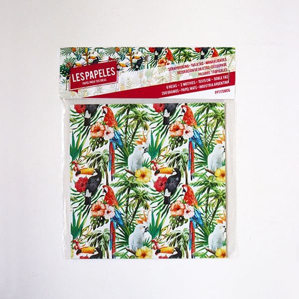 Pajaros Tropicales son papeles para scrapbooking impresos bifaz en ilustración mate 200 grs, listos para explotar tu creatividad con laminas de 15×15 cm.